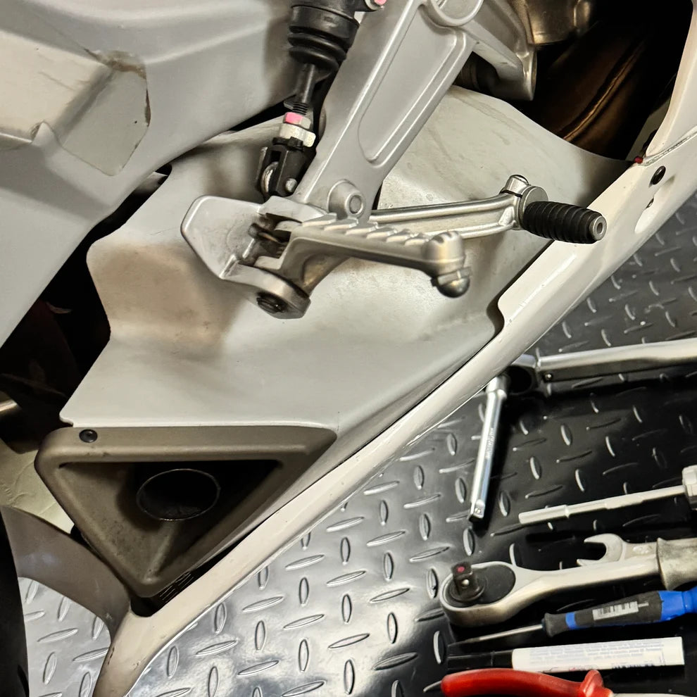 - Supplied with rubber plug in the lower fairing for quick drainage of liquids (according to FIM regulations)