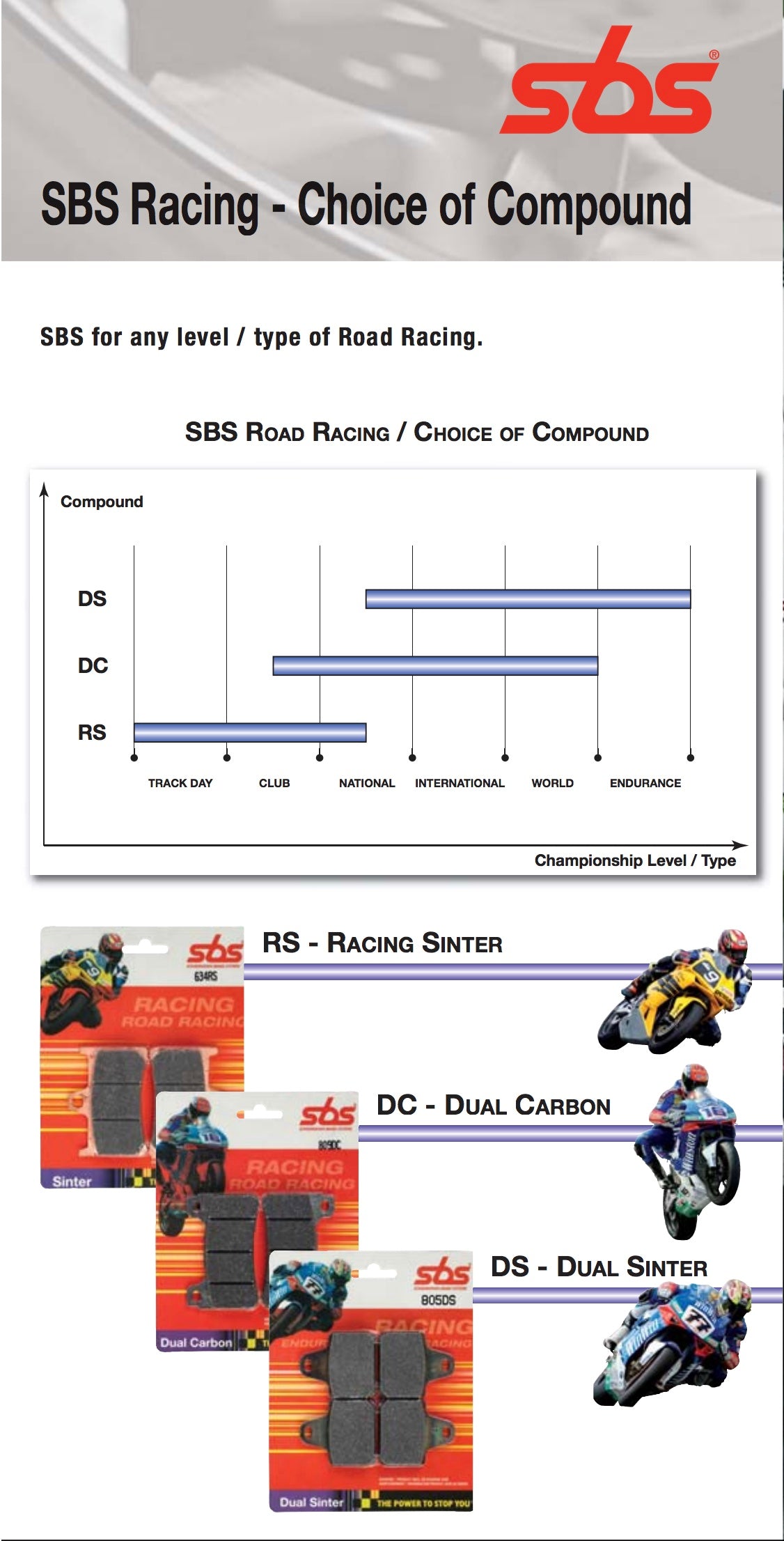 Used by the worlds top teams and riders since 2001 introduction to win 7 World Championship titles and numerous of National Championships. DC is the choice of Champions for Superstock, Supersport and Superbike classes. Find DC bedding-in instruction and technical information at www.sbs.dk