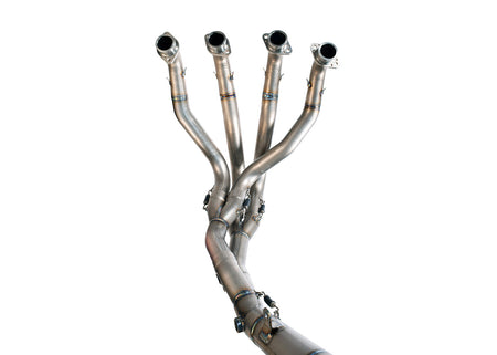 The R&D work for the powerful Japanese motorbike relies on the cooperation with important teams in World Endurance Championship and national championships.The first step consists of a full system allowing to optimize performance on Stock engines. Collectors are available in Aisi 304 stainless steel and different silencers can be combined to it so as to respond to different aesthetic and sound tastes: Force silencer l.350mm respects the 102 dB limit (without db killer); Konix silencer l.300mm (107 dB, as required in many national championships); MOTOGP, racing and extreme silencer. The 2019 evolution then was born in cooperation with an important BSB team and allows to optimize performance on tuned or Superbike engines (for this reason, it can be mounted with RACING FAIRINGS only). 2019 evolution is provided with titanium CNC connections improving collector matching and durability. Such technical solution grants the reliability, also of the titanium system, for those teams taking part to the World Wndurance Championship. Also in this case different silencers can be combined: Force silencer l.350mm to respect the limit of 102 dB (without db killer); Konix silencer l.300mm (107 dB, as required in many national championships); extreme and ultralight GRID-O silencer.